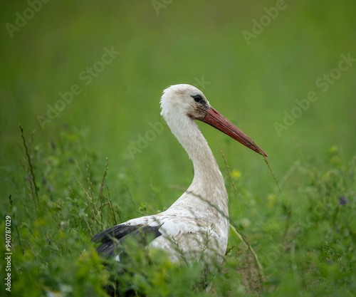 Fototapeta premium The white stork (Ciconia ciconia) is a large bird in the stork family, Ciconiidae. Its plumage is mainly white, with black on the bird's wings.