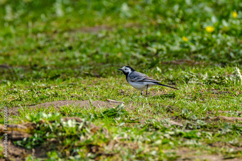 © Martins Vanags, Obraz premium The white wagtail (Motacilla alba) feeding in the green field