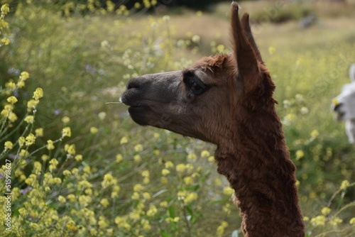 © ChrisOvergaard, Obraz premium The wild Alpacas roaming the Saqsaywaman ruins above Cusco in Peru