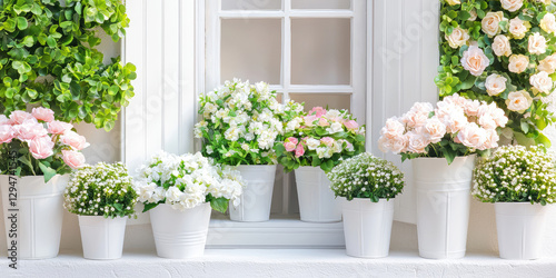 Fototapeta premium The window of a cozy cute flower store. Exterior of a flower store. Various...