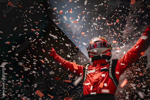 © Rojo, Obraz premium The winning driver of the Formula 1 car race raising his arms from the podium. Confetti flying.