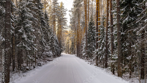 © Andrey Nikitin, Fototapeta premium The winter snow road in the forest