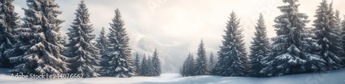 © Maxim Borbut, Fototapeta premium The winter woodland is covered in snow, surrounded by a pale mist. A seasonal banner.