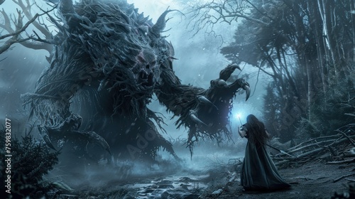 Obraz premium The Witch Woman faces a huge and scary monster in the forest AI generated image