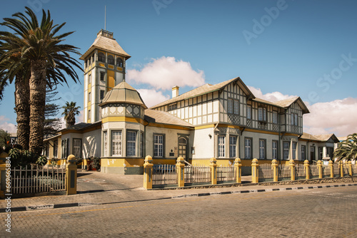 Fototapeta premium The Woermannhaus in Swakopmund, Namibia. Built in 1894, it is a one of city?s oldest buildings and historic icon with its German-style fa?ade. Today it serves as a public library and art center.