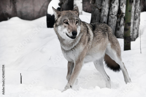 Fototapeta premium The wolf jumps out and thinks where to run, against the backdrop of trees.