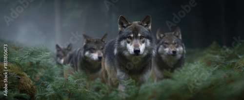 © ckybe, Obraz premium The wolf pack travels as a team through the dense forest bushes.