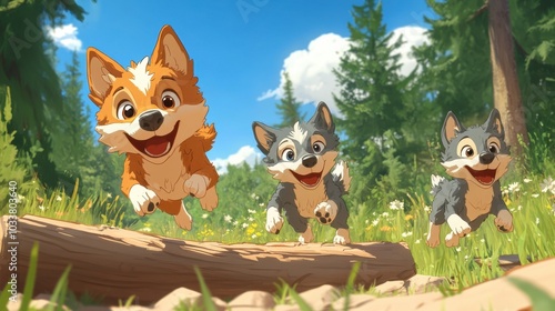 Fototapeta premium The wolf pup races with its friends through a meadow, jumping over logs and weaving between trees in a playful game of tag, in cartoon style