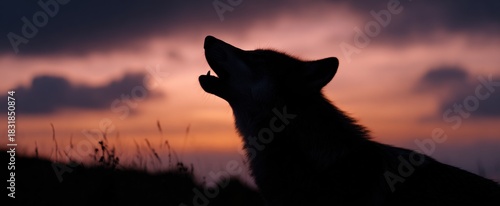 Naklejka premium The wolf vocalizing at dusk paints a shadowy song across the fading sky.