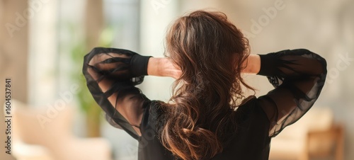 Fototapeta premium The woman enjoying a moment of relaxation in a cozy indoor setting.