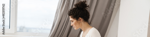 © Drobot Dean, Fototapeta premium The woman looking at the phone while sitting on the bed in a room