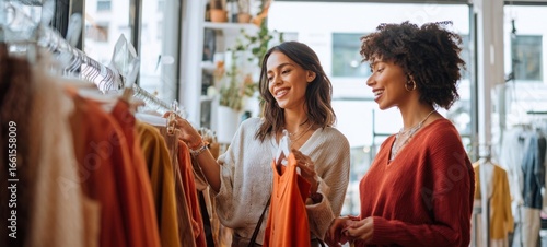 © Karyn, Obraz premium The women enjoying a shopping experience in a trendy boutique.