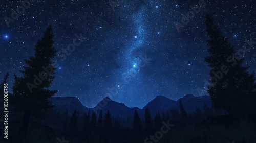 Naklejka premium The wonder and enormity of the night under the stars on a cloudless night. Milky Way and silhouettes of trees and mountains. Beautiful milky way with stars
