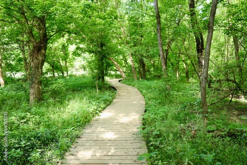 © Al, Obraz premium The wood boardwalk trail in the forest on a spring day.