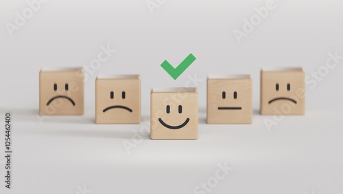 © feng, Obraz premium The wooden blocks are placed on the table, and customer service best excellent business rating experience. Satisfaction survey concept.Shopping service on The online web and offers home delivery.