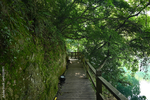 © young, Obraz premium the wooden path in the green forest on the edge of green water in Nanjing