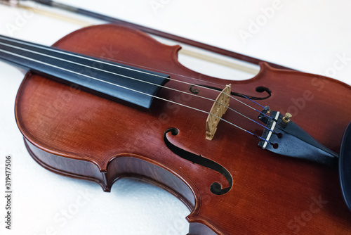 © Watcharin, Fototapeta premium The wooden violin put on white background,in front of blurred bow,show front side of string instrument