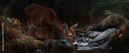 Naklejka premium The woodland deer drinks gently from the stream bathed in peaceful forest calm.