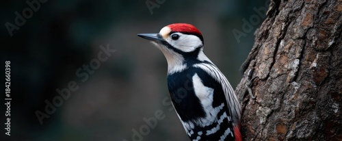 © ckybe, Obraz premium The woodpecker pecking the tree bark with its beak nonstop
