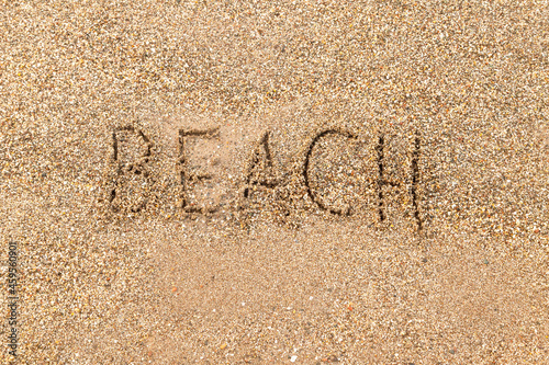 Fototapeta premium The word Beach is written on the sandy seashore