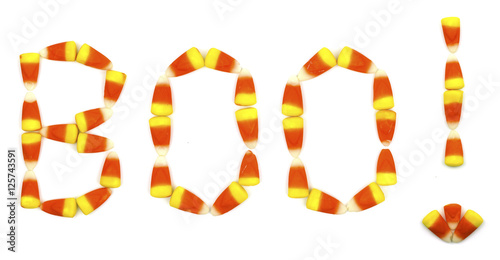 © excaliburmedia, Fototapeta premium The word "BOO!" spelled in candy corn