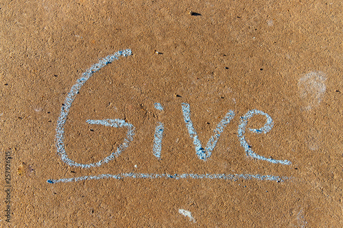 Fototapeta premium the word Give written with sidewalk chalk on gray concrete pavement background
