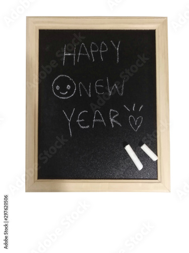 © wanpiya, Fototapeta premium The word happy new year on the blackboard.Chalk and blackboard on a white background.