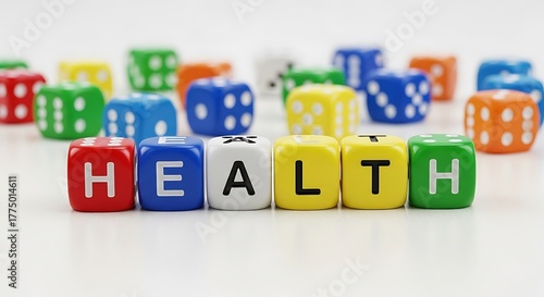 © Roushon, Obraz premium The word health spelled out with colorful dice on a white surface, symbolizing wellbeing, healthcare, and the importance of making healthy choices in life