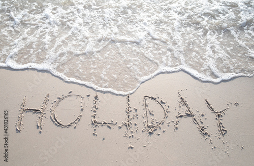 © Direk Takmatcha, Fototapeta premium The word "HOLIDAY" written in the sand in capital letters.