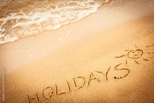 © Voyagerix, Fototapeta premium The word holidays written in the sand on a beach