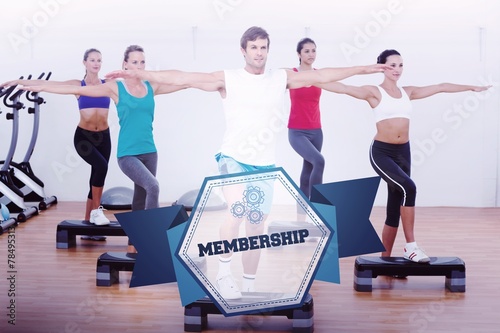 © WavebreakMediaMicro, Naklejka premium The word membership and fitness class performing step aerobics
