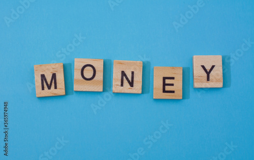 © Anzhelika, Obraz premium The word Monday. Text day of the week in wooden letters.Black letters on wood, blue background with shadows. blank for design