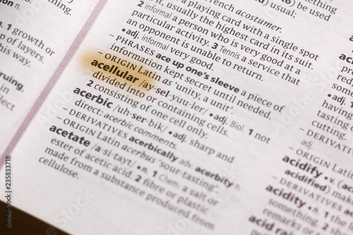 Fototapeta premium The word or phrase Acellular in a dictionary.