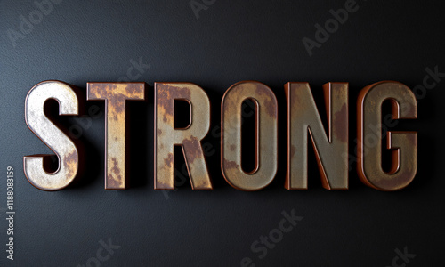 © Photo Builder, Naklejka premium The word 'STRONG' in industrial-style 3D metallic letters with rust textures