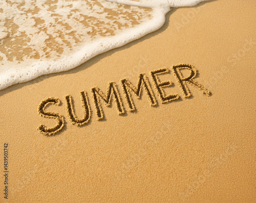© Natalia, Fototapeta premium The word "SUMMER" written in the sand near the sea, with a wave softly approaching the letters.