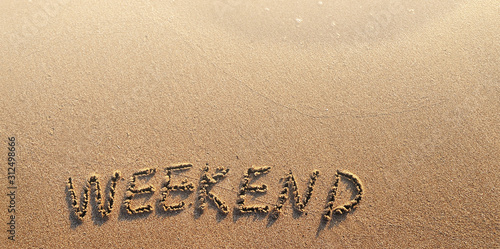 © MagicsPhotos, Fototapeta premium The word weekend written on sand. Summertime concept.