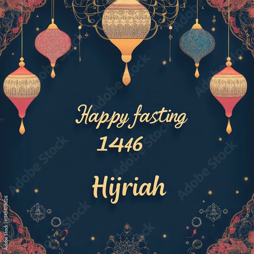 © Cahman stock, Naklejka premium the words happy fasting 1446 hijriah are decorated with Islamic ornaments such as lanterns and crescent moons, blue background