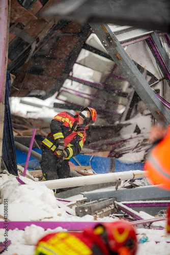 © fabrus, Obraz premium The working moments of the search and rescue teams who were under the rubble in the roof collapse under the weight of snow. Firefighters inside a collapsed house are looking for survivors.