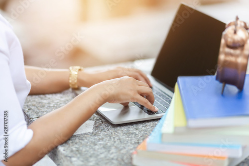 Fototapeta premium The working student is using the computer to print his work with intent,...