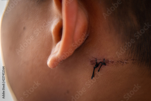 © thawatpong, Obraz premium The wound was sewn with black yarn due to torn skin.
