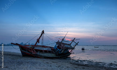 Fototapeta premium The Wreck was left on the beach with the beautiful twilight sky.