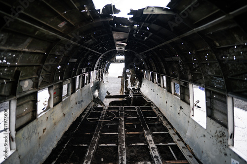 Naklejka premium The wreckage of an abandoned DC 3 plane on a black ocean beach in Iceland....