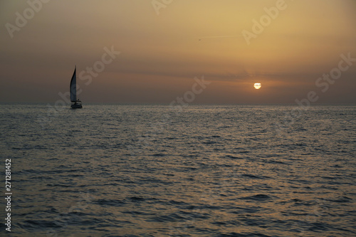 Fototapeta premium The yacht stands in the sea against a picturesque sunset