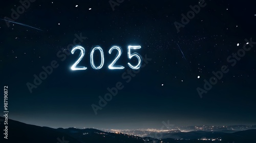 © Felippe Lopes, Fototapeta premium The year 2025 written in the night sky with stars and a distant city.