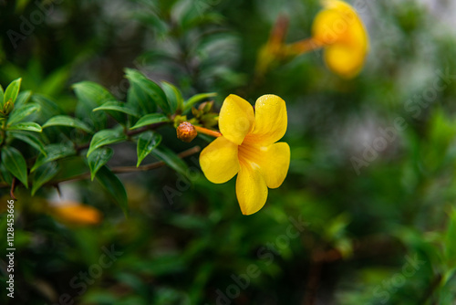 © MinBaMyaing, Fototapeta premium The yellow bell flower in Burma, Allamanda cathartica or Golden Trumpet Flower, is a beautiful golden yellow flower with bright green leaves.