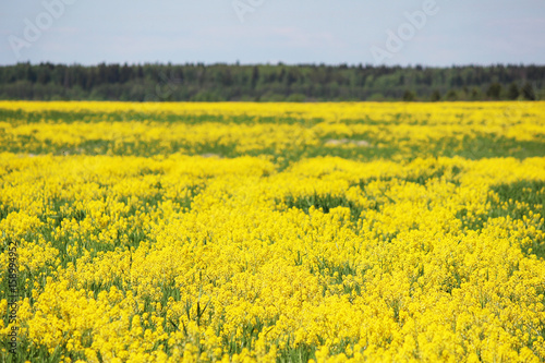Fototapeta premium The yellow field of the blossoming Barbarea rape in early summer.