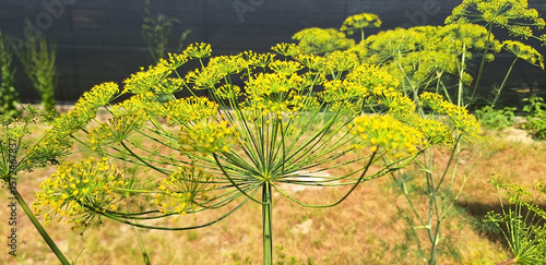 Fototapeta premium The yellow flowers of anethum graveolens or foeniculum vulgare bloom in...