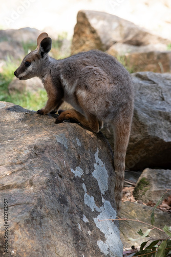 © susan flashman, Naklejka premium The Yellow-footed Rock-wallaby is brightly coloured with a white cheek stripe and orange ears. It is fawn-grey above with a white side-stripe, and a brown and white hip-stripe.