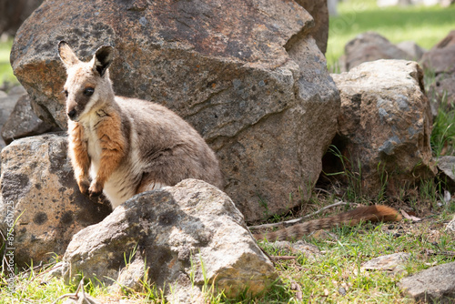 © susan flashman, Naklejka premium The Yellow-footed Rock-wallaby is brightly coloured with a white cheek stripe and orange ears. It is fawn-grey above with a white side-stripe, and a brown and white hip-stripe.