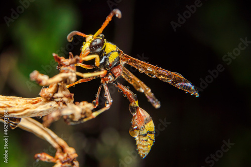 © parianto, Fototapeta premium the yellow jacket is perched on the grass taken at close range